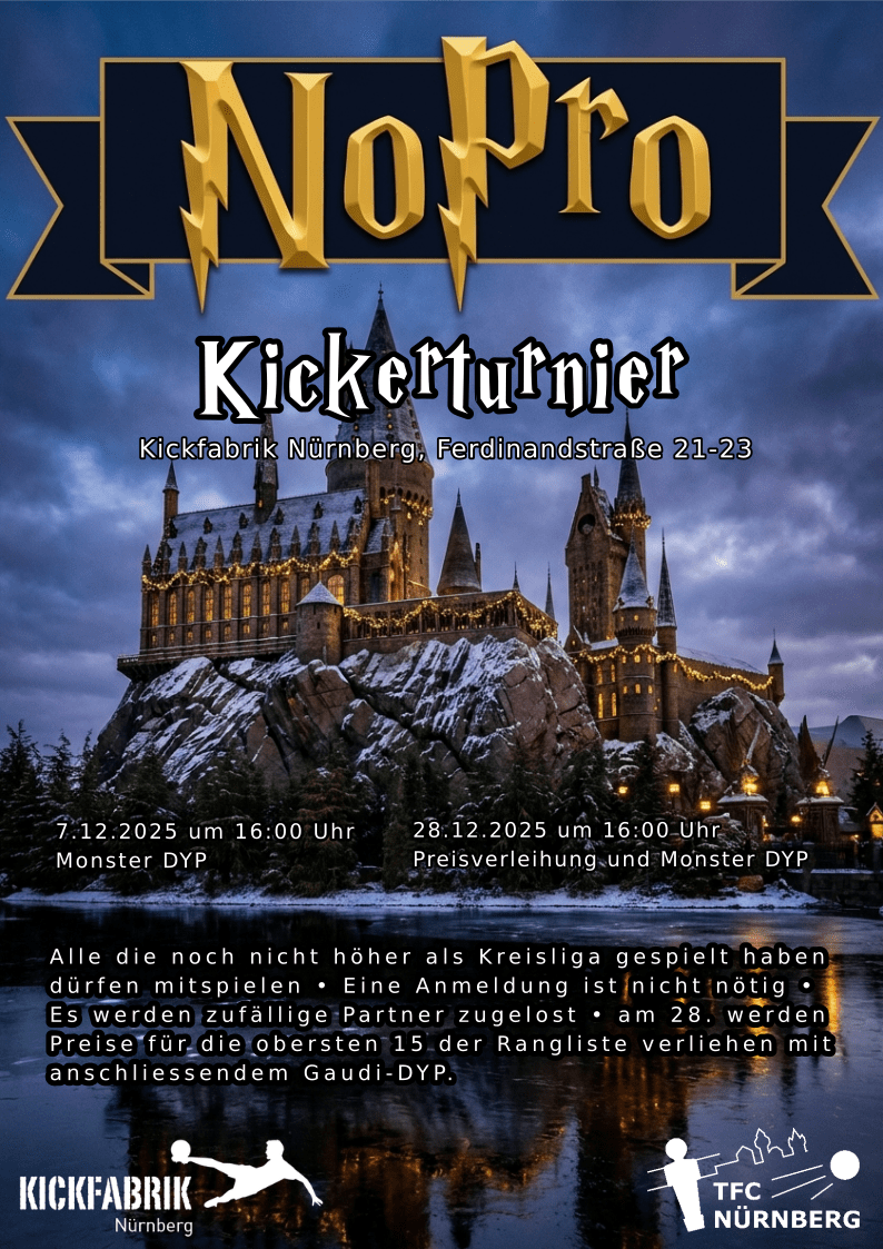 Am 28. Gibts tolle Preise für die ersten 15. Plätze in der aktuellen NoPro Rangliste (https://tfc-nuernberg.de/rangliste/) und danach noch ein legendäres Jahresabschluss-Gaudi-Turnier.